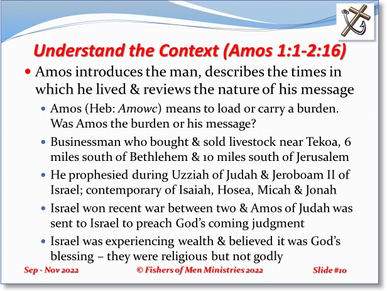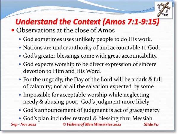 Setting the context for these final chapters in the Book of Amos can be done with a series of bullets summarizing the important words of the Prophet. The first starts with Amos, himself. The bullet is that God sometimes uses unlikely people to do His work. Amos was an ordinary shepherd who also planted and maintained a vineyard. It was this routine kind of a man whom God chose to deliver words to kings and leaders all across Israel and Judah, and the nations surrounding them.