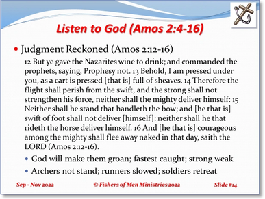 Judgment Reckoned (Amos 2:12-16) But the Lord cannot meditate for long on these things because the sins of the people took the good things the Lord did for them and turned them into ugliness as well. They polluted the Nazirites by feeding them wine and tried to hinder the prophets of God by demanding they did not prophesy. With these thoughts, God says He will make these people groan under the load of what they have done like being pressed underneath a cart, fully loaded with the sheaves of the field. The load is far too heavy for them to defeat.