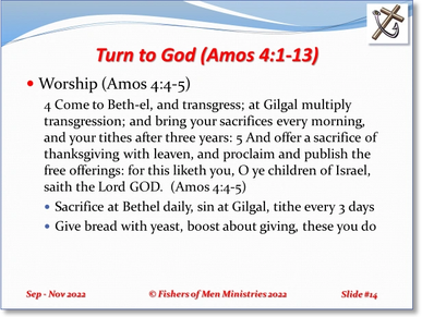 Not only was Israel over-indulgent and self-satisfied in themselves, she took the religious requirements of Judaism into blasphemous worship in their pagan, heathen religious observances. First, they went to Bethel which was the substitute worship place because the Temple of God was in Jerusalem, Judah. They sinned by being in the wrong place. Second, they multiplied their purposeful sin and transgression of the Law because they went to Gilgal with their sacrifices. Again, the sacrifices were to be made to the Lord, not some statue with open arms inviting parents to lay their infant children there. Further, they were offering sacrifices every morning because of their shame over what they continued to do the night before. The Law required them to offer sacrifices for sin two, or at most, three times a year. It stressed the idea sacrifice for sin was seen as an occasional thing; not a repetitive, nonrepetitive practice to ease the conscience, but a recommitment to the God of the Universe. They paid tithes every three years rather than the tithe of the increase whenever that increase occurred. They were at the wrong place, offering wrong gifts, to a wrong god, for the wrong reasons, at the wrong time, but “it is just like you to do these things.”