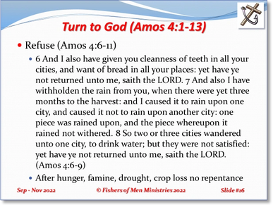 He continues in verse 8 that people from two or three cities where the rain was prevented might wonder for miles to a city where the rain was still allowed to fall in search of water to drink but even when they found it, they were not satisfied. Nevertheless, says the Lord, “yet have ye not returned unto me.” After hunger, famine, drought and crop loss, Israel would not repent of their ways and return to worshipping Him.