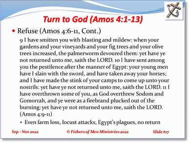 Verse 9 continues the same line of presentation as in verses 6 – 8, above. Here, the Lord says He submitted Israel’s crops to scorching heat and mildew. He sent swarms of locusts to devour the fig and olive trees, but even that would not cause Israel to turn back to the Lord. Verse 10 says He sent plagues like those he sent upon Egypt during the freeing of Israel. God saw that the young men were killed in wars and all the horses that served them were led away. He filled the air with the smell of death, but the people would still not return to the Lord. Next, God destroyed cities with the same kind of power He used against Sodom and Gomorrah. In that case God was cleansing the vile city and rescuing Lot and his family. Nevertheless, none of Lot’s sons would leave the city, so Lot left with his wife and two daughters. His wife looked back at the city after God warned her not to do so and she was turned to a pillar of salt.