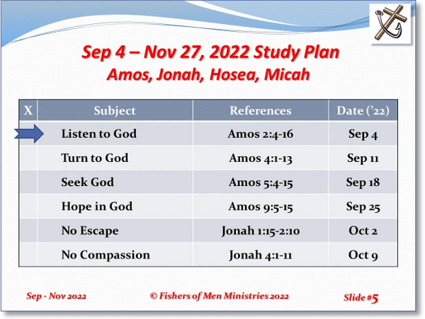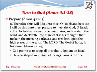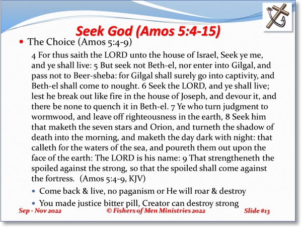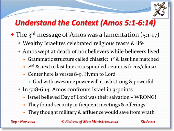 Here Amos uses a classic Hebrew form of literature to communicate this story called the Chiastic form. As shown on the slide, the first and the last lines had to match, the second and next to last verses support each other and so on until verses 8-9 provide the focal message. The message here is simply, “the Creator of all, Jehovah is His name, and He is coming after Israel with lightening speed” (Amos 5:8-9, author’s paraphrase). Today’s Bible study explores that truth.