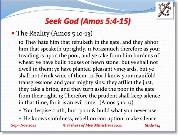 God provides more on the kinds of people He is talking about in verse 12. He says He knows their numerous sins and how terrible they are. These people press or afflict the people who are trying to live righteously. They take bribes of the dishonest among them in order to make their personal plight more tolerable while everyone else suffers. They even turn away the poor at the gate as they just want a place to beg for their existence. Yes, He says in verse 13, in that time the wise ones will live in silence because they know anything they say will be used to further persecute or force them to even a lower existence.