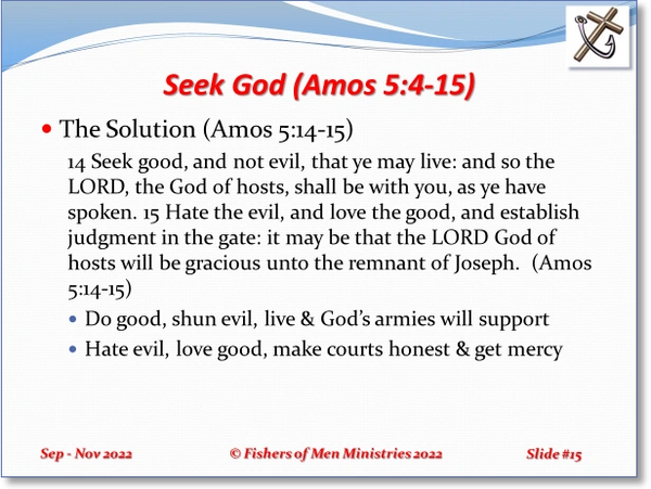 We still have verse 15 to examine for this study. It continues from the previous verse with God’s encouragement to “Hate the evil, and love the good, and establish judgment in the gate: it may be that the Lord God of hosts will be gracious unto the remnant of Joseph.” The first of this verse again challenges those in that day to make the things they have control or influence over right. Try to cause as much holiness in that world as you can. Those who own property, run businesses or employ people, make those things holy unto God and manage what you have in accordance with God’s wishes. His reference to Grace for the remnant of Joseph was an honor to the first-born son of the love of his life and wife, Rachel. It also referred to the ten tribes of the North or Israel for whom Amos’ message is written. God would save King Josiah from His wrath. He may well save many more. We know that the wrath due each of us, as believers, was poured out on Jesus at Calvary, so there is no wrath left for us (Rom 8:1). Recall that history has the captivity of Judah (not Israel) served for 70 years, and their release is well documented in the Scriptures. That may well be the grace on them as they repented, returned and were restored.