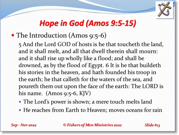 The first two verses of the focal passage establish about whom it is that we are talking. The leading word “and” in verse 5 forces a look back to the earlier verses of the chapter to catch that contribution of knowledge. In verse 1, Amos sees a vision of God demonstrating His awesome power and authority. He sees God standing next to the Temple’s altar saying, “Strike the tops of these Temple columns, so the foundation will shake. Bring down the roof on the heads of the people below. I will kill with the sword those who survive. No one will escape!” (vs 9:1). Verses 2 thru 4 talk about how thorough His sentence upon them will be. No matter how deep they dig, or high a mountain they climb, even if their enemies drive them into exile, they cannot escape.