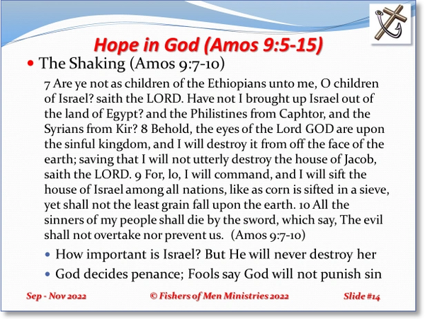 Amos continues the words of the Lord with, “Have I not brought up Israel out of the land of Egypt? And the Phistines from Caphtor, and the Syrians from Kir? In each case, the children of the brought out became distant enemies of God, growing farther away with each new generation (Barnes Commentary). God is asking if the same thing is happening in all the children of each nation, and if that includes Israel. In verse 8, the Lord says His eyes are on this sinful nation, and that, if this is the case, He will destroy it from off the face of the Earth. God edits His comment in verse 8, and says, “Saving that I will not utterly destroy the House of Jacob.” This edit is fully consistent with God’s promise that there will always be a righteous or believing remnant of Israel (2 Kings 19:30-31, Isa 10:20-22, Rom 9:27, 11:5). Verse 8 catches that salvation of a remnant of Israel whom God will not destroy.