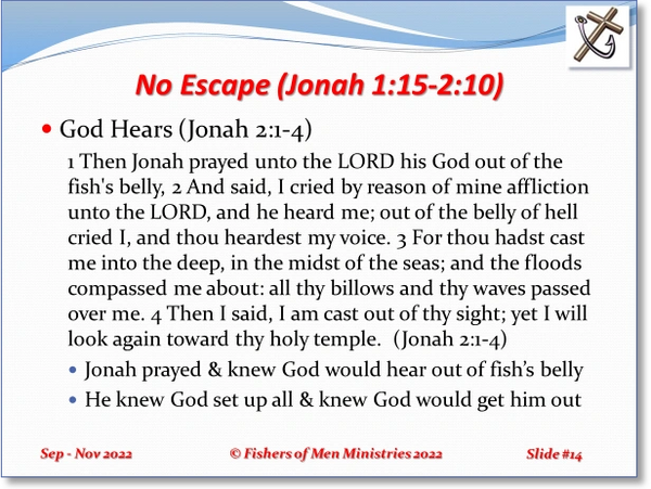 "7 When my soul fainted within me I remembered the LORD: and my prayer came in unto thee, into thine holy temple. 8 They that observe lying vanities forsake their own mercy. 9 But I will sacrifice unto thee with the voice of thanksgiving; I will pay [that] that I have vowed. Salvation [is] of the LORD. 10 And the LORD spake unto the fish, and it vomited out Jonah upon the dry [land]" (Jon 2:7-10, KJV). Click here to select Bible Studies or page down to read the background materials.