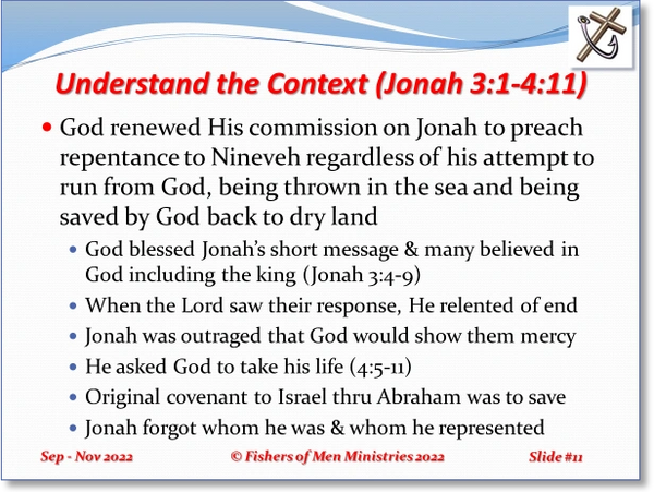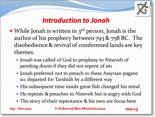 The minor prophet’s Book of Jonah is just four chapters long. The first two of those chapters are the focal passages for this study. Jonah served as prophet between 782 and 741 BC during the reign of Jeroboam II of Israel. Jeroboam II was an evil king in the eyes of the Lord, but Jonah’s work deals with Nineveh, the capital City of Assyria, Israel’s worse enemy. Assyria would take Israel captive in 722 BC.