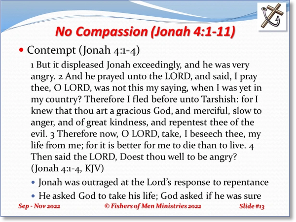 But consider the context of Jonah’s displeasure and anger. He is upset with the Lord because He has decided not to destroy the entire city of Nineveh with its population of more than 120,000 people. Certainly, a man of God with any compassion at all would consider that level of human loss and be grateful that God found a better way to deal with them other than destruction. God told Abraham that He would not destroy Sodom and Gomorrah if there were even ten righteous people there (Gen 18:32). If our God would repent of destroying those evil cities if there were only ten righteous people there, would He not have pity on Nineveh for the sake of the whole city repenting and crying out for mercy? When Jesus spoke of the Pharisee and the publican entering the Temple, He was not impressed with the self-righteousness of the Pharisee saying, “11 … God, I thank thee, that I am not as other men [are], extortioners, unjust, adulterers, or even as this publican. 12 I fast twice in the week, I give tithes of all that I possess” (Luke 18:11-12, KJV). No, Jesus was impressed by the publican, standing afar off, who would not lift up so much as his eyes unto heaven, but rather smote upon his breast, saying, “God be merciful to me a sinner” (Luke 18:13). Jonah was so angry he asked God to take his life from him in that very moment. But even these accusations and terrible displays of poor judgment did not change the even-handed response of the Father as He asked Jonah, “Is it right for you to be angry about this?” (Jonah 4:4, NLT).