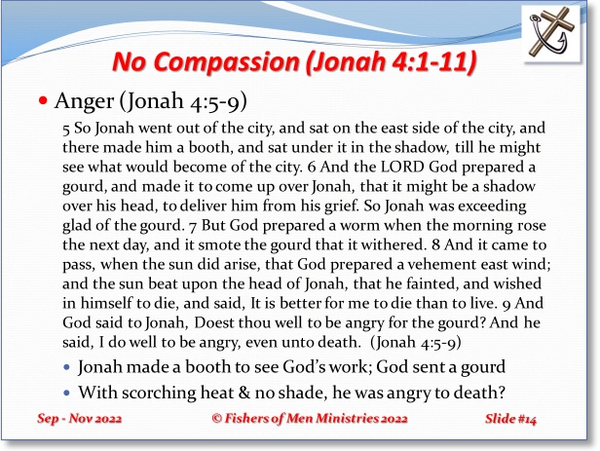 One could almost see Jonah turning on his heels and stomping off like the spoiled little child in verse 5. He goes to the eastern edge of the city and erects a shelter from the hot sun. He wants to see exactly what happens to this city. Verse 6 adds that God prepared a leafy plant to be there to provide more shade for Jonah. The Bible reports that Jonah was very grateful for the plant and the shade it provided. But, in addition to the leafy plant, God prepares a worm to be in the same area. The next morning the worm eats the bottom of the leafy plant and destroys the shade Jonah was enjoying from it (vs. 7). So, the sun rises and the heat was intense. God added a mercilessly scorching wind to multiply the heat to the point that Jonah fainted and again wished himself to be dead (vs. 8). He said it was better for him to be dead than to live like this. It seemed to Jonah that everything in his life was going in a bad way. The sun was always hot in this land, but the plant and the shelter provided relief from that. But when the worm came and cut down the plant, it was just too much for him to handle.
