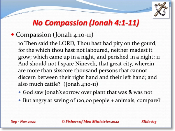 In contrast, says the Lord, the city of Nineveh has more than 120,000 people living there who cannot tell their left from their right when it comes to spiritual matters. They are spiritually blind yet have demonstrated a full willingness to repent, fast, pray for help, dress in sackcloth and throw ashes over themselves to demonstrate their repentance from sin and dedication to the Lord. God is asking Jonah why he feels so much sorrow and pain for the dead plant, while he is angry that God feels compassion for the 120,000 souls Jonah wants God to destroy. Further, God maintains, there are thousands of innocent animals which will die if the people of their nation are destroyed. Should God not feel sorrow about destroying the people who responded to the message God sent by Jonah? Are they not worthy of more consideration than the plant Jonah feels so sorry about?
