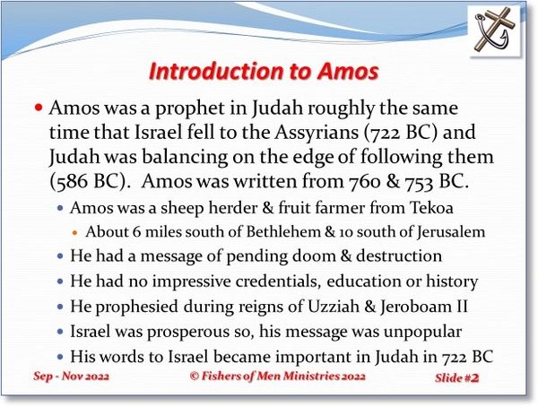 Amos was a sheep herder and a fruit farmer from Tekoa, a town in Judah about 6 miles south of Bethlehem and 10 miles south of Jerusalem. His message was consistently one of pending doom and destruction because of Judah’s gross sin and rejection of God. Amos had no impressive credentials, education or history. He was just a man called by God and proven accurate through prophesies all of which came true.
