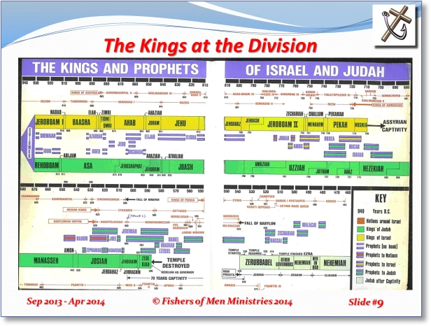 The detail on this slide is great but its clarity is poor, at best. The next two slides are more clear but miss the relationships between all. The most clear information is contained in the large-print timeline of the transitions of Israel and Judah over time.