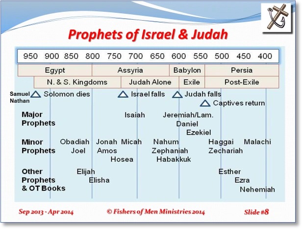 Here is a view of categories of Prophets relative to dates of major events in Israel. This is useful in understanding the prophet's messages to their people during pre-exilic, exilic or post-exilic periods of history. Recall Israel's exile to Assyria in 722 BC & Judah's exile to Babylonia in 586 BC.