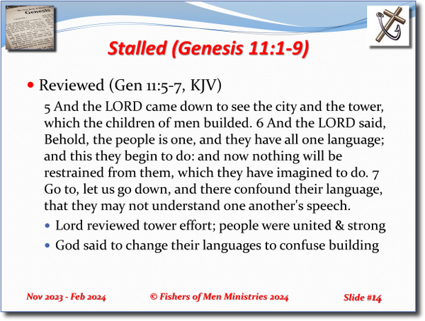 Verse 8 summarizes the results, “the Lord scattered them abroad from thence upon the face of the earth and they left off to build the city” and its tower. Their focus was the immediate need to find others of their new language that they might communicate and understand one another. They longed for the tight unity that they once had, but it would not be found in those they once communed with. Now, they must search out others like themselves and find new places to congregate together. The impact was very much like God’s allowing persecution among the early church at Jerusalem. They were complacent in staying where they were, but God’s need was for them to, “receive power, after that the Holy Ghost is come upon you: and ye shall be witnesses unto me both in Jerusalem, and in all Judaea, and in Samaria, and unto the uttermost part of the earth” (Acts 1:8). In the power of the Holy Spirit, the early Christians had to leave Jerusalem for Judea, Samaria and the uttermost parts of the earth. In the early church, God allowed persecution. In Babylonia, He allow the confusion of multiple languages. Now, the Babylonians were moving out in every direction looking for places to settle with people who spoke their language. And when they found them, they could celebrate the Lord God who sent them.