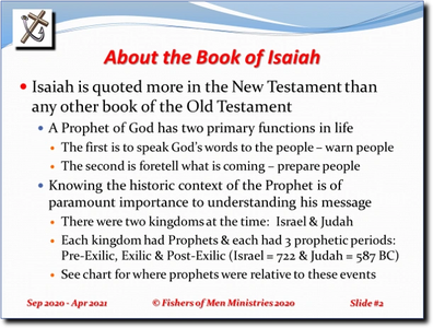 Isaiah is the first major prophet documented in the Scriptures. His ministry took place between 744 and 700 BC. While his ministry was relevant to Israel and Judah, he says more about the coming Messiah than any other Book in the Old Testament. Chapters 9 & 53 describe birth & crucifixion of Jesus 700 years ahead.
