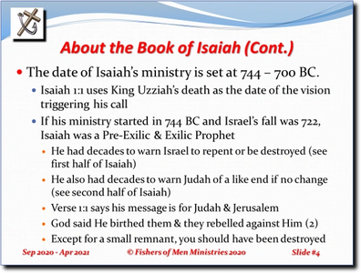 So, Isaiah had the experience of hearing the prophesies to Israel (see chart) as they warned Israel of their sin and turning against God. He began his ministry about 744 BC, or 22 years before the Fall. While God protected Israel for decades, her refusal to turn back to Him resulted in His taking His hand off them, and Israel was taken into exile. Most of them never returned. This differed from the exile of Judah to Babylon beginning in %87 BC. Judah repented of her rejection of God and turned toward returning to Jerusalem to begin rebuilding for Judah’s return.