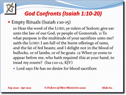 Now we see that God is repulsed at their attempts to bribe God with sacrifices while completely denying Him with their actions. The bloods sacrifices were supposed to be outwards indications of inward truths. But here, Israel worshipped other gods in their daily practice of living while they offered blood sacrifices to maintain a front of obedience but certainly not from their hearts. God told Isaiah He had no joy or feelings of fulfillment in the offerings of a people whose hearts were far from Him. An application statement for today: GOD CANNOT BE BOUGHT!
