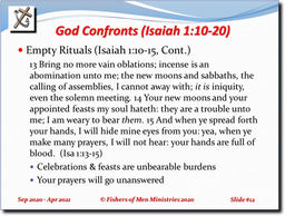 So, God told Isaiah to tell the people He had no need nor desire for vain or abominable offerings, their celebrations of new moons or sabbaths or even their calling together of assemblies (vs 13). He says even the solemn meetings are a burden to Him. The reason is that all the outward oblations are supposed to reflect the inward allegiance of the people of God and these people are just not any longer a people of God. Their festivals and religious celebrations have become so obviously fake that He hates them down to His soul, they trouble Him, and He tires of even hearing them.