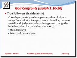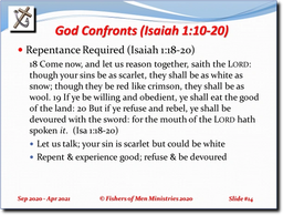 Isaiah takes the first step by telling Israel’s heralds to cry out loudly, to lift their voices like loud trumpets and to make the noise impossible to ignore. The people had become so hardened to sin that they had to be made aware they were even sinning. We know the process: we do something we know to be sin, the Spirit makes it obvious that we are committing sin through the severe discomfort only God can cause. But we explain it away by following the thoughts of the world. We say to ourselves that the godly life is passe; that is not the way things are anymore; it’s antiquated to think that way anymore. So, we commit the sin again, but this time it is easier; the sting of sin is diminished somewhat. And this process continues until we cannot even recognize that sin is sin anymore. Our hearts have become hardened to it. We must be reminded that what we are doing is sin against God, and it has near-term and long-term penalties. Near-term we lose the power associated with the Holy Spirit. He does not leave us because we cannot lose Him, but our effectiveness as Christians in the power of the Holy Spirit is no longer there. Our prayer lives are in shambles, God does not seem to answer prayers any longer, we pray healing prayers but no one gets healed. We pray prayers of help, but no one is helped. We have become a CINO – a Christian in name only. People cannot tell the difference between us and the lost people standing next us. No power, no peace, no presence. We have become CINOs.