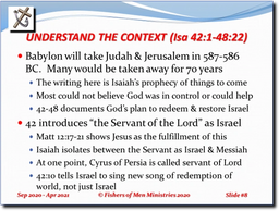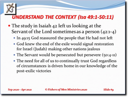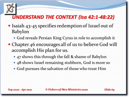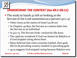 Understanding the Context (Isaiah 49:1-50:11, Cont.)In 49:15, however, God reassured the people of the captivity that He had not been defeated by the Babylonian gods, nor had He left Judah after the defeat of the people. God knew far ahead of time that the completion of the exile would generate thoughts of God’s restoration of Israel (Judah). And this, in turn would cause many nations to envy Israel or be jealous of their God. This study focuses on the need for all people to continuously trust God regardless of the apparent circumstances. God sees into the future and the associated victories to provide abundant evidence of His care and involvement in the redemption of the chosen people. As a people of this century, we have the evidence of history to see the same evidence of God’s hand in leading Israel to numerous victories in the post-exilic period.