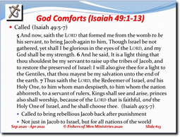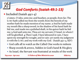 Included (Isaiah 49:1-4)In verse 49:1, the Lord speaks through Isaiah to call attention to His redemption of His people far beyond the small group contained within the captivity or even the captors. The coasts and the isles are beyond any reasonable description of Israel in their current situation. But as the Lord takes action to lead them out of that situation, He insists that the wider world listen and pay close attention to what is about to happen. As the obvious question forms regarding these events, the first is who will lead this effort? Isaiah begins to describe the Servant God has prepared for this feat. God called this Servant before he was born; that is, he was sill in the womb; in the depths of his mother’s being when the Lord mentioned his name. The characteristics of the Servant in verse 2 are equally supernatural. God made his mouth like a sharp sword – every word could cut to the bone. And the protection God offered was as if the Servant was resting in the very shadow of his hand. The Lord speaks of His redeemed in Christendom as those who are in the hand of the Father and no man is able to pluck them out (John 10:29-30). Here, it is that same level of impossible strength that protects the Servant as he is hid in the shadow of the Master’s hand. He had made this arrow a polished shaft and in God’s quiver he can be found. He is one of the tools of the lord for freeing Israel and releasing them back to the promised land.
