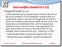 Verse 3 starts the revelation that He was despised and hated. His wisdom among the masses was not recognized or endorsed by leadership. They accused and questioned Him as He taught. They repeatedly tried to catch Him up or snare Him into speaking against the Sanhedrin, the Scriptures or the Roman or Hebrew governors. They evidently believed if they could get Him to speak either heresy, blasphemy or treason, they could bring charges against Him, but He was very careful to make statements like “Render to Caesar the things that are Caesar's, and to God the things that are God's. And they marvelled at him” (Mark 12:17). When questioned about charges that He said he was a king, He said, “My kingdom is not of this world: if my kingdom were of this world, then would my servants fight, that I should not be delivered to the Jews: but now is my kingdom not from hence” (John 18:36). The crowds of people accepted His teaching and reacted with changed lives and healed diseases while the leadership condemned Him and rejected His teachings. Those who wanted to keep their positions were forced to join them in rejecting Jesus. Recall that Nicodemus went to talk with Jesus under the cover of night (John 3:1-21). At the end of Jesus’ life, Nicodemus, joined by another leader, Joseph of Arimathaea, to request permission to remove Jesus’ dead body from the cross and bury Him before the Passover (John 19:38). They were much more brave in His death than while He lived. The common men and women lauded His words and sought opportunity to hear more. The leaders despised Him and had no respect or esteem for Him. He felt the deep sorrow of knowing He was the only provision for saving all men from eternity in Hell, yet His message was blocked and prevented. John the Baptist knew the right answer when he said, “The next day John seeth Jesus coming unto him, and saith, Behold the Lamb of God, which taketh away the sin of the world” (John 1:29). Would that message get out?
