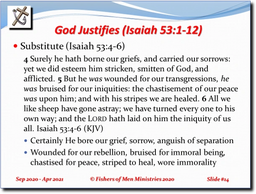 Verse 5 lists the Servant’s response to every kind of sin we commit. “He was wounded for our transgressions” tells us that His abuse was for the open rebellion we have committed against His Law and stated directions. “Bruised for out iniquities” says that He was broken or crushed for our mischief. “Chastisement of our peace was upon Him” means Satan’s attempts to take away our peace was laid upon Him. “With His stripes we are healed” expresses the full substitution or propitiation of His person for ours. Put simply, Jesus (God the Son) took our place in receiving all punishment rightfully due to us.