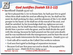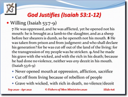 Verse 7 – 9 uses the words “yet He opened not His mouth’ three times signifying that Christ did not make a move to defend Himself or to limit His payment for man’s sin. “He was oppressed and afflicted, yet He opened not His mouth.” “He is brought as a lamb to the slaughter, and a sheep before the shearer is dumb, so He opened not His mouth” Our Lord stated, “17 Therefore doth my Father love me, because I lay down my life, that I might take it again. 18 No man taketh it from me, but I lay it down of myself. I have power to lay it down, and I have power to take it again. This commandment have I received of my Father” (John 10:17-18). When Peter drew his sword and cut off Malchus’ ear to prevent His arrest in the Garden, Jesus said, “Put up thy sword into the sheath: the cup which my Father hath given me, shall I not drink it?” (John 18:11).