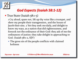 Verse 3 begins to explain to the hard-hearted Christian this way. When you ask why you fast and no one notices; how you afflict your soul but no one acknowledges it. It is because people can see a fake for miles away. The world is full of people claiming to be something they are not. When we fast to be noticed, we have lost our reward. Verse 4 shows the person fasting for the sake of strife or debate; an opportunity beat one’s fist on the table to make a point. “But is this the kind of fast I want” asks the Lord (verse 5). Is it a day when you afflict your soul? A day when you can bow down low to the ground, to put on sackcloth and spread ashes all over you? Isaiah asks, “If this is what you will call a fast and an acceptable day of the Lord? The appearance of what you are doing has absolutely nothing to do with the reality of the act. It is like the Christian who is asked to pray for healing of a person while visiting in the hospital, but he must delay because he left his vial of oil at home. The oil has no more healing power than the sackcloth and ashes have repenting power. The power of healing comes from the dedicated servant of God speaking through the Spirit of God within him or her to the God of the universe, the Creator of all that exists and asking Him to do exactly what He has told us to ask. We see healings and conversions and miracles because of a right heart with God and a personal humility to know that the servant is not the special one, but the One he serves certainly is. We can do nothing in ourselves, but if we will yield ourselves to Him, He will do everything He wills through us. We cannot DO things, but we can ALLOW Him to do things through us!