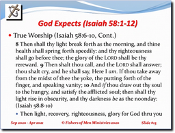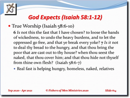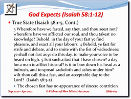 Now (vss. 6-10) God explain what real worship through fasting is. He starts by asking if this is not the fasting He has directed. He describes it as releasing the bands of wickedness, breaking the bonds of heavy burdens, letting the oppressed go free and breaking every yoke upon their necks. He continues that true fasting has to do with feeding the hungry, housing the homeless, clothing the naked and taking care of those of your own house.