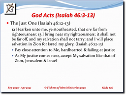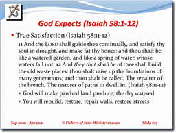 On the next slide, Isaiah picks up with Verses 8-10. God says if you will do these things, your light will begin to shine with the brilliance of the new day’s sun, your personal health will prosper, your righteousness will be obvious and you will understand that bringing glory to the Lord is the real reward for the servant. But the rest of the rewards are equally amazing: when you call upon the Lord (pray) He will answer, when you weep the Lord will show you His presence (“Here am I”).
