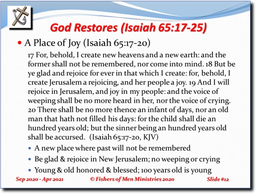 So, Isaiah begins this discussion of joy buy providing what would become the lead off sentence for Revelation 21 regarding the New Heaven and New Earth. Of course, John’s comment there came nearly 1,000 years later. John tells us that the New Jerusalem will come down from God out of the New Heaven because the first Heaven and Earth were passed away. Isaiah says the former will be remembered no more. The people will rejoice in the New Jerusalem and experience joy rather than sorrow. Even more, they will be glad and rejoice forever. God will join His people in rejoicing and there will be no more weeping or crying there. Again, John endorses those comments by quoting Isaiah 65:17-20 in Revelation 21:1-8 and adding that “God, Himself would wipe away their tears.”