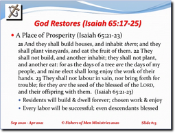 Here we can see a part of the prophecy Isaiah gives us from the Lord is flavored with words more easily understood here than in Heaven. When Israel and Judah return from exile, they will, in fact, build house for themselves that will not end up being indwelt by someone else. The crops will be their own. They will not build or plant for others. The meaning of these guarantees is that we will not be overcome again. The length of Israel’s survival will be as long as the life of a tree, i.e., virtually endless. This is the promise of eternal life when seen as a prophecy of our part in the eternal Kingdom of God. Notice the mention of “the elect” in 22. The elect is that group of people who will be with the Lord in His future Kingdom. They are the entirety of the saved of Jesus Christ who will join Him in the New Heaven and the new Earth.
