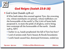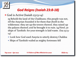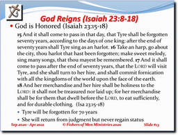 Israel and Judah heard the prophecies of defeat and exile for their nations because they turned on God but continued as if they did not. This response seems to have set a model for other nations as well. After establishing oracles and judgments against several nations, many ignored the warnings and saw the same results. We saw Judah’s Ahaz express doubts that God could help against Assyria and paid dearly. Israel also ignored God’s warning and went into exile because of it. As they watched these happenings, they doubted how a prophecy of a Messianic Kingdom could possibly come to pass. In a culture of gods with territorial or national authority, they could not understand the universal nature of our God. Isaiah used this set of scripture proven the errors of these thoughts. He also drew attention to the total frustration of Babylon’s state of exaggeration and Tyre’s state of dependence on wealth. Only full dependence on God could have saved them.