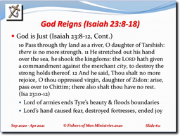 In verse 10, God through Isaiah invites the armies of nations who once feared Tyre to come and invade Tyre and pass through them as easily as a river passes through a country, even a flooding river like the Nile. God says Tyre no longer possesses any strength at all, so they cannot. God stretched forth His hand to take this nation down and spoil any pride they might have had. He has personally given the commands from across the universe against the merchant city and destroy their strongholds. He goes on to warn them that there will be no further reason for rejoicing as a nation that oppressed young women. Rather, you will experience fear sufficient to drive you out of your cities that were once safe and try to find safety in nations outside your own boarders. Notice that God did these things – there is no escape from His justice.