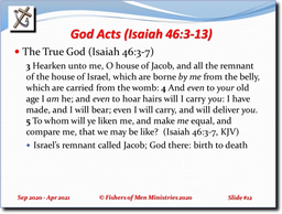 Chapters 46 thru 48 provides encouragement for all of us who believe in the Lord and trust Him. While Chapter 46 delivers the message that God will be faithful to execute His plan for all of us who believe and trust in Him, 47 shows the final days of Babylon and their fall. Babylon was publicly shamed through the defeat of its forces and its way of life. Chapter 48 tells the bad news of Israel’s continued stubbornness. In addition, however, it also shows how God is even more stubborn to keep the promises He made to Israel and all the nations of the world. And His promises continue to echo throughout the entire creation, “Come unto me, all ye who labour and are heavy laden, and I will give you rest” (Matt 11:28). His redemption is sure and near.