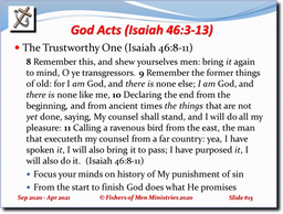 But remember this, show it around to each other and bring it into your minds again and again, you who commits evil and treason against me. Remember what you were taught decades ago: “I am God. There are no other gods around and there is certainly none like me.” God says He is the only one who can tell what the end is even before the beginning of it and forecast events from deep history which have not yet happened. God’s statements and advice will persevere whatever He choses to do. Whether He is calling an animal from far away to action or a man to carry out His commands; what He says He will make happen and what He has purposed will happen. Our God is the Trustworthy One!