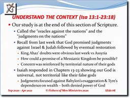 Understanding the Context (Isaiah 28:1-33:14, Cont. ) Judah’s King Ahaz relied on Assyria to protect them from Syria and Israel instead of Jehovah God. They forgot that God offered blessings and prosperity with His protection while a nation from which they could buy protection would require a very high price for that protection. While Assyria attacked the Syria/Israel coalition for Judah, they also dominated Judah from the inside. Assyria demanded very high monetary payments from Judah leaving them weakened against any further attack. When Hezekiah became king, he multiplied the error of seeking international alliances rather than turning to God. He sought a protective relationship with Egypt, the same country from which held the whole of Israel in total and cruel bandage just a few hundred years earlier. God brought Israel out for Egypt and King Hezekiah was placing them back under Egypt. Isaiah tried to reason with Judah that the purpose of God’s recent judgments on them was focused on repentance, redemption and restoration. Israel would certainly fall and be taken into captivity in 722 BC, but Judah’s failure to repent and return to God caused them to face similar judgment in 586 BC. Israel’s exile to Assyria would see very little restoral in the Promised Land. Judah would begin her return to the Promised Land in 445 BC (Neh 2:1-6). The destruction of Jerusalem and the captivity of Judah was required to get her repentance, redemption and restoration.