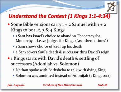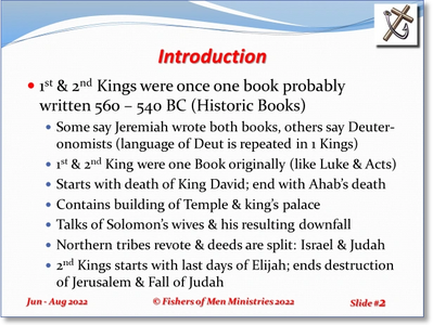 Welcome to the historic Books of 1 & 2 Kings. They are the documented history of Israel under its chosen monarchy. Israel was started and functioned as a theocracy where God led His chosen people and chose judges to oversee them. Israel rejected God's leadership and chose the monarchial form of government, instead.