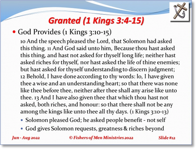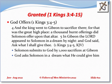 Verse 15 finishes today’s study by beginning, “And Solomon awoke, and, behold, it was a dream.” Later, we find ample evidence that the blessings God promised Solomon came true. He was the wisest man who ever lived. He had riches and honor beyond what any king or non-king has ever had. Even when he failed the Lord and went off in search of the real meanings of life (“Vanity, vanity. All is vanity!”), God was with him and brought him back. Solomon’s conclusion after his search of several years was, “Let us hear the conclusion of the whole matter: Fear God, and keep his commandments: for this is the whole duty of man” (Eccl 12:13).