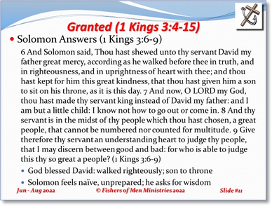 So, this is where Solomon comes to (and we come to) for God to ask what he (what we) want(s) of Him. Solomon says simply, “Give therefore thy servant an understanding heart to judge thy people, that I may discern between good and bad: for who is able to judge this thy so great a people?” (1 Kings 3:9). Solomon wants wisdom of judgement to properly judge the people of the Lord.