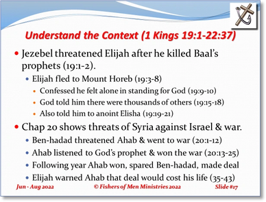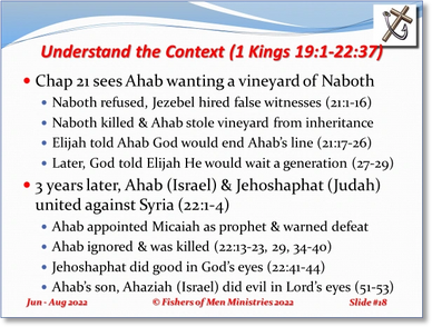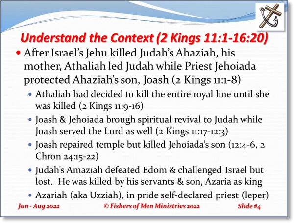 The succession of kings throughout the regions resulted in wars and rumors of wars. Recall that God told Elijah to anoint Jehu King of Israel and Ahaziah King of Judah and Elisha to replace him as prophet at the end of last week’s discussion of context. Now, we begin with Jehu killing Ahaziah and the priest, Jehoiada, protecting Ahaziah’s son, Joash, while his mother reigned over Judah. Joash was also known as Jehoash. Athaliah made plans to eliminate Joash’s entire royal line in order to maintain her control over the throne of Judah. In time, the priest, Jehoiada was able to bring Joash to Judah’s throne and Athaliah was put to death. Jehoiada initiated spiritual reform in Judah and saw Joash become a servant leader under God (11:1-12:3). Together, they initiated several repairs to the temple of God in Jerusalem. Regardless of all the combined good they did, Joash caused the death of Jehoiada’s son when he elected to speak against Joash’s leadership (2 Chron 24:15-22). When Joash later lost a Syrian campaign against him, his servants murdered him. (2 Kings 12:17-21). The Prophet Elisha also died during Joash’s reign (13:14-20).