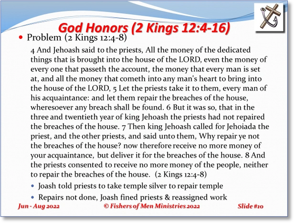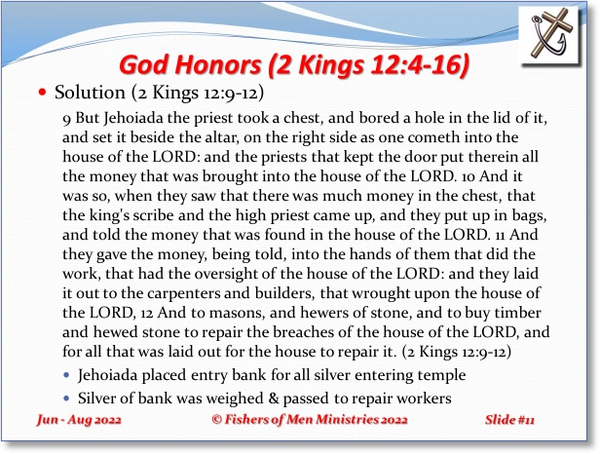 Jehoiada, the priest who King Joash specifically selected for this work had the problem of segregating the money that comes into the temple as regular assessments, payments of vows, or voluntary gifts from any other money coming into the temple. Jehoiada selected a large chest and had a hole bored through the lid of it. He realized that all three kinds of donations mentioned would come from the hands of the people into the temple as they attended the regular services. So, Jehoiada placed the chest on the right side of the altar all who came into the house of the Lord and the be overseen by the priests who tended that door. Verse 10 reveals that as the money came in it was a large amount. The scribe and the high priest put the money in bags and recorded the amount they took out of the chest for temple records.