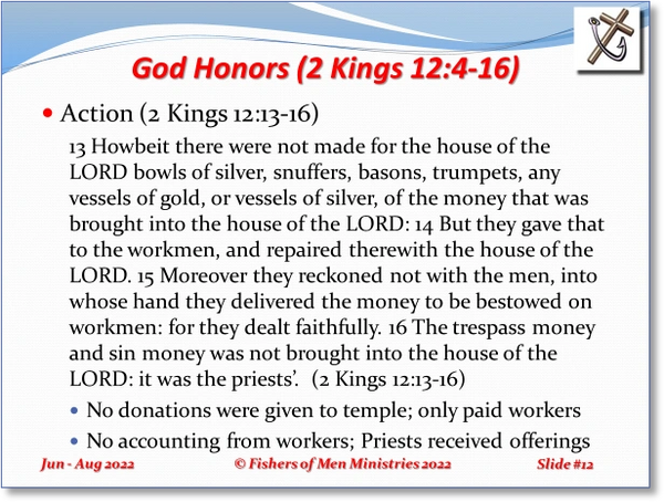 Our historian is careful to report that none of the money was used for “making silver bowls, lamp snuffers, basins, trumpets, or other articles of gold or silver for the Temple of the Lord” (vs. 12:13). Rather, all of it was paid to the workmen for repairing the House of the Lord (vs. 14). Verse 15 mentions that the construction supervisors required no additional accounting of the money given to the workers because they were “honest and trustworthy men.”