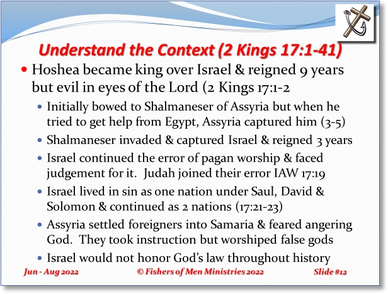 Verses 17:17-41 provides documentation that Israel (the ten northern tribes) continued worship strange gods and rejecting Jehovah and His covenants and laws throughout their existence. Even when Israel was a united country under Kings Saul, David and Solomon, they still worshiped false gods, built alters to them and sacrificed their children to them (17:21-23). When the Assyrians first began relocating to Samaria, they feared God and had Jewish religious leaders offer classes on the Hebrew faith. Nevertheless, when the Assyrians learned the Jewish faith, they continued their lack of respect and worshiped their false gods and pagan ways.