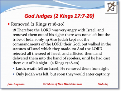 God’s reaction was just and predictable. He had a history of never-ending patience and forgiveness, but the limit was finally reached; the last once of toleration was expended and God had to act. For all the things that were listed on the previous three slides and understanding that the list is not just for the most recent abuses, but rather, constant abuses across the centuries and even millennials since we have been created. The “going in” comment is “Therefore the Lord was very angry with Israel” (vs. 18). His reaction was described briefly as, He “removed them from His sight; there was none left but the tribe of Judah only.”