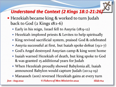 One night the Lord sent His angel into the camp of Assyria and killed 185,000 soldiers. When the king arose and saw the destruction, he broke camp and immediately returned to Nineveh and stayed there. Isaiah’s prophecy became reality, but in a subsequent visit to Hezekiah, Isaiah prophesied the king would die, but was wrong (20:1). The king prayed the Lord would let him live to finish his work in Judah. God heard his prayer and saw his tears and granted him an additional fifteen years to finish. In pride, however, Hezekiah received a visit from Babylon and showed them all he had. Isaiah shared a prophesy that Babylon would overtake Judah and take them into captivity. Hezekiah’s son, Manasseh succeeded Hezekiah and reversed every advancement he made toward the Lord.