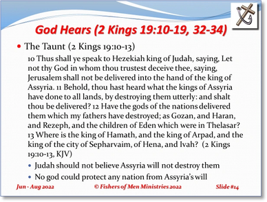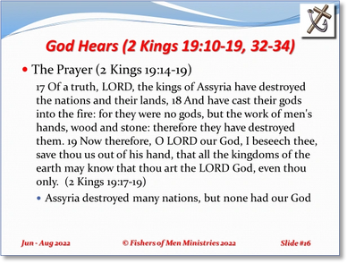 Sennacherib’s letter to Hezekiah continued by asking if he knew where all the previous kings were who came up against Assyria, like kings Hamath, Arpad, city of Sepharvaim, Hena and Ivah (19:13). All of these had entered into battle with Assyria, and all were destroyed as their nations were taken into captivity. Briefly, then, there were no countries who succeeded against Assyria in battle, nor were there any gods who protected their nations from the attack of the Assyrians. Of course, these political threats and warnings were always construed to decrease the number of actual wars necessary to achieve their political goals and objectives.