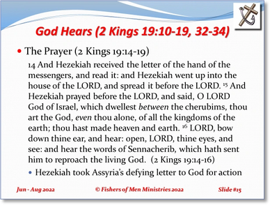 Hezekiah, unlike most of the kings of Israel and Judah we have studied, was a man of God. As soon as he received and read Sennacherib’s letter, he wanted to consult with God about it. Verse 19:14 says as soon as he knew the content of the letter, he went to the Temple to lay out the situation before the Lord. He explained the whole thing to the Lord by saying, “…15 O Lord God of Israel, which dwellest between the cherubims, thou art the God, even thou alone, of all the kingdoms of the earth; thou hast made heaven and earth. 16 Lord, bow down thine ear, and hear: open, Lord, thine eyes, and see: and hear the words of Sennacherib, which hath sent him to reproach the living God.” (19:15-16).